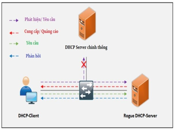 - Rogue DHCP Server (Máy chủ DHCP giả mạo): Kẻ tấn công có thể thiết lập một máy chủ DHCP giả mạo trong mạng, cung cấp các địa chỉ IP sai lệch hoặc không hợp lệ cho các thiết bị. Khi các thiết bị nhận được cấu hình mạng từ máy chủ DHCP giả mạo, chúng có thể bị chuyển hướng đến các server độc hại, gây ra tấn công Man-in-the-Middle (tấn công trung gian).