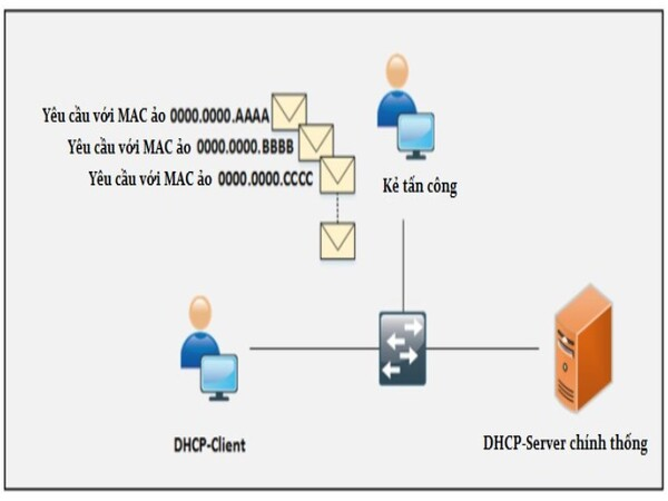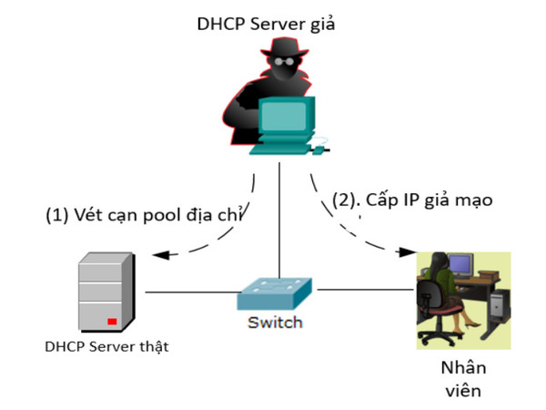 - Tấn công làm gián đoạn dịch vụ: Một máy chủ DHCP giả mạo hoặc tấn công từ chối dịch vụ (DoS) có thể làm gián đoạn hoạt động của máy chủ DHCP hợp pháp, khiến các thiết bị không thể nhận địa chỉ IP và làm gián đoạn toàn bộ mạng.
