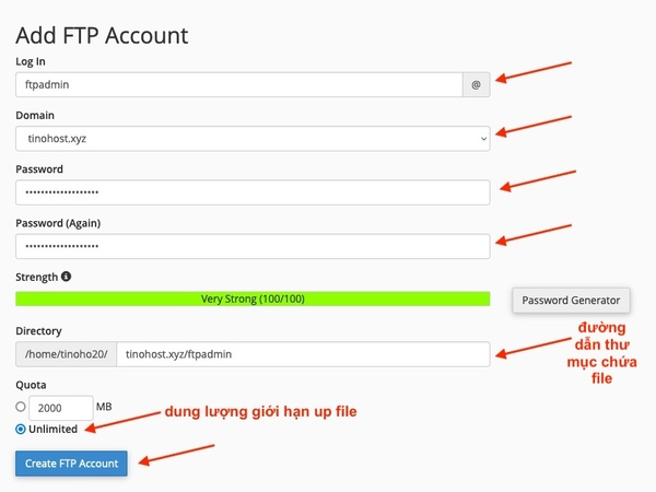- Nhấp vào “Create Account”: Hoàn tất việc tạo tài khoản FTP.