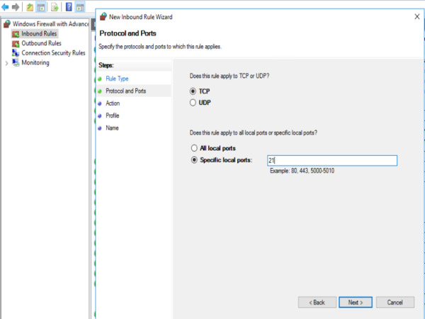 - Thêm quy tắc cho phép: Trong “Inbound Rules,” chọn “New Rule.” Chọn “Port” và nhấn “Next.” Nhập cổng mà - FileZilla Server đang sử dụng (mặc định là 21 cho FTP). Nhấn “Next” và chọn “Allow the connection.” Hoàn tất quy trình.