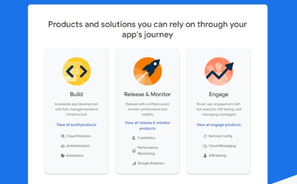 Firebase cung cấp một loạt các sản phẩm và dịch vụ được chia thành nhiều nhóm cụ thể. Mỗi nhóm có những công cụ và chức năng riêng biệt, nhằm phục vụ cho các nhu cầu đa dạng của lập trình viên.