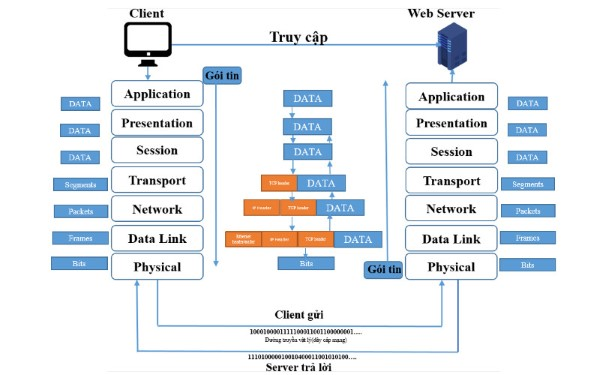 - Đóng gói dữ liệu: Dữ liệu sẽ được đóng gói tại từng lớp. Mỗi lớp sẽ thêm thông tin điều khiển và định dạng.